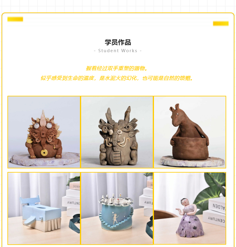 上課時間:早九點到晚五點(晚上學員可根據需要自習晚可到十點) ●學習內容 拉坯、修坯、泥塑、彩繪、注漿、貼花、微巨陶藝、泥板填釉、剔花、施釉、燒窯等。 ●學習成果 作品成果:20個拉坯作品、3個泥塑作品、1-2個彩繪作品、5個注漿作品、2個貼花作品、5個指尖陶藝作品、2個大件拉坯作品、1個泥板填釉作品、1個剔花作品。 技能成果:掌握拉、修坯技法、泥塑成型方法、自主上釉并能操控電窯。 ●適用人群 適用于陶藝專業學習和渴望用陶瓷載體進行創作的人群 。