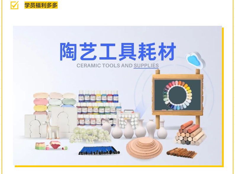 由一站式陶瓷服務平臺——水流星向學員提供陶藝耗材、工具、設備的選品服務及專享優惠折扣。
