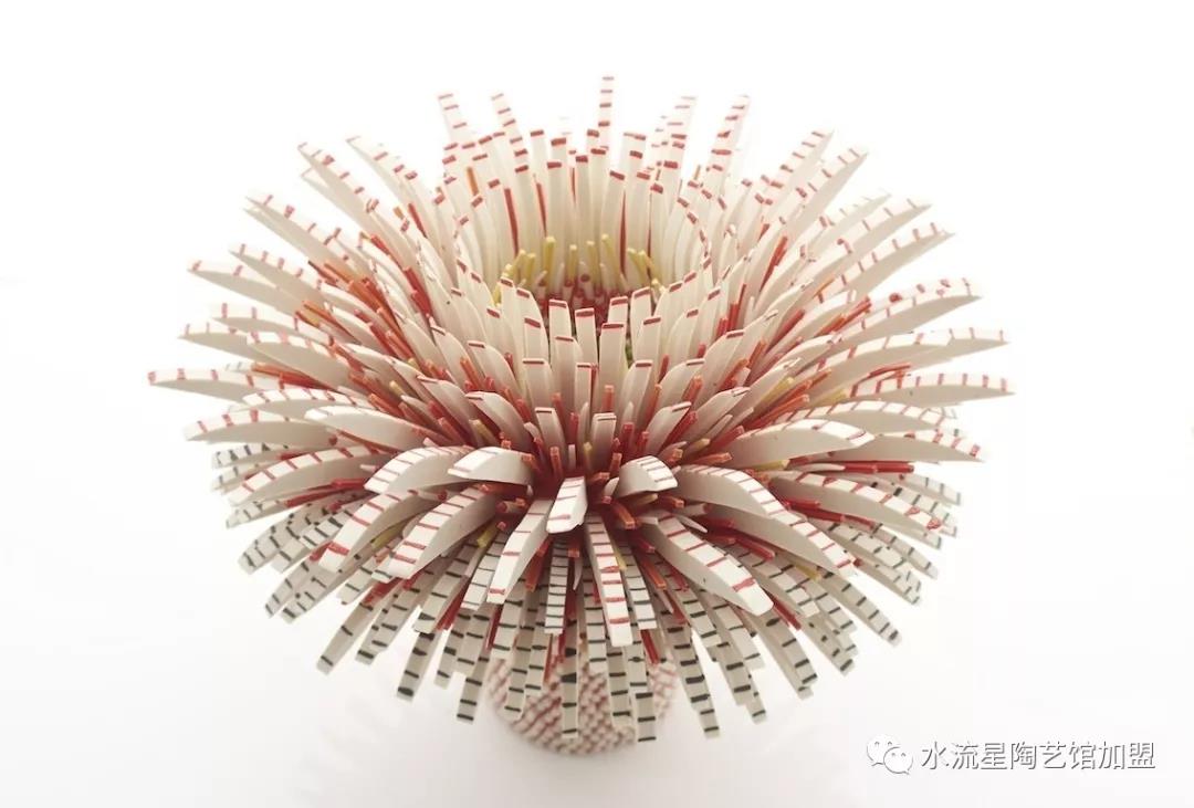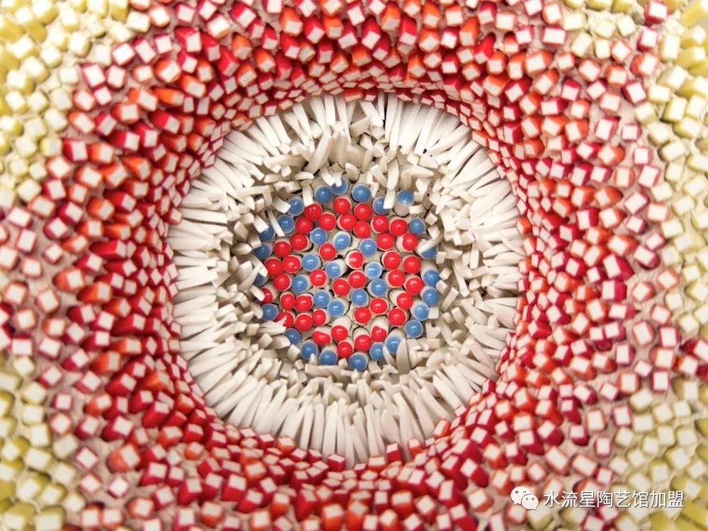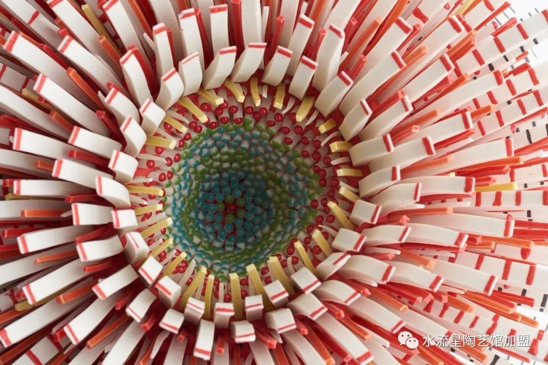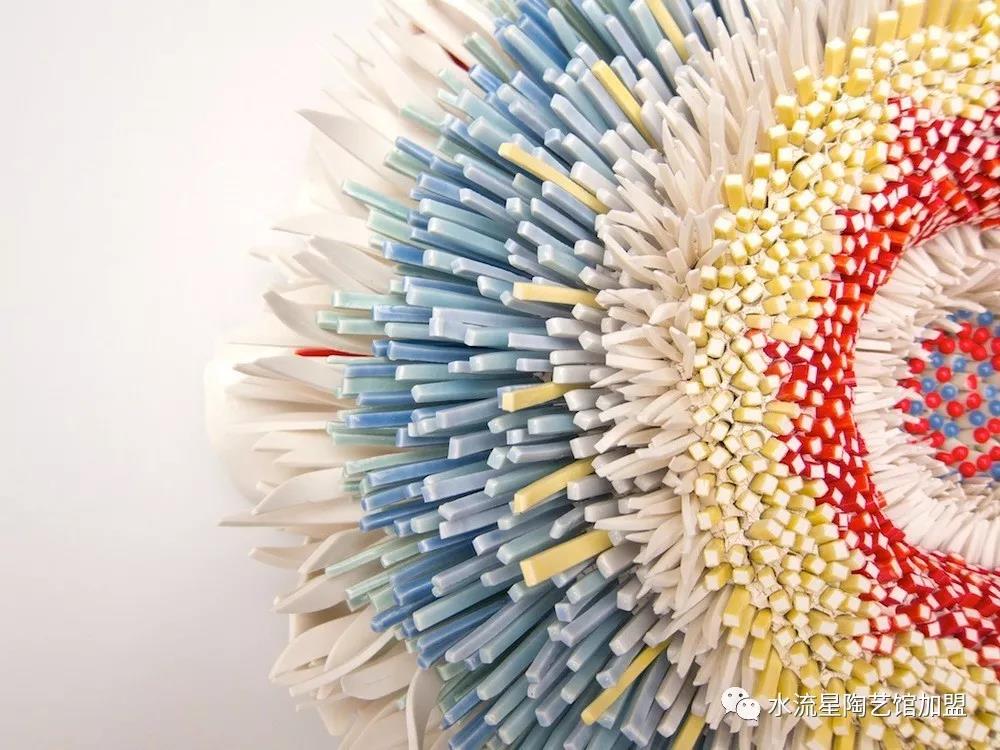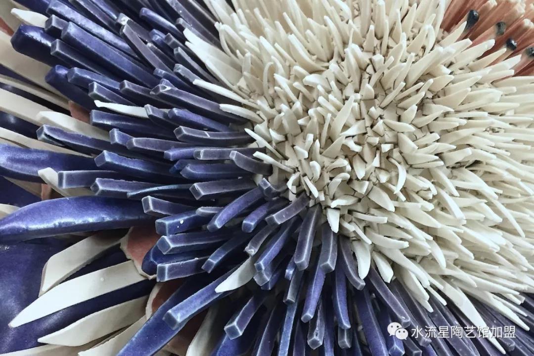Peled根據(jù)它們的長度,顏色和形狀來安排碎片。長條碎片被作為花蕊點綴在中心。為了構(gòu)建這些華麗的作品,Peled使用板坯輥來創(chuàng)建粘土片。然后她用錘子將它們打碎成小塊。這些碎片被分類后拼貼在她的雕塑中。