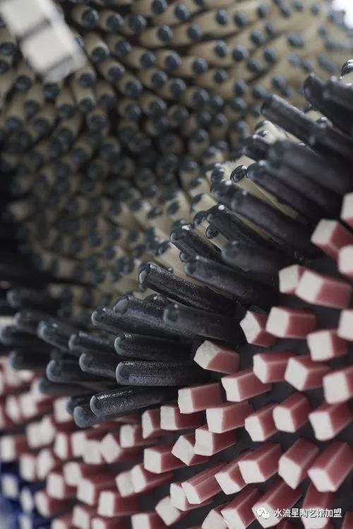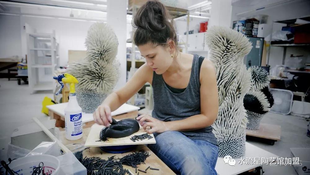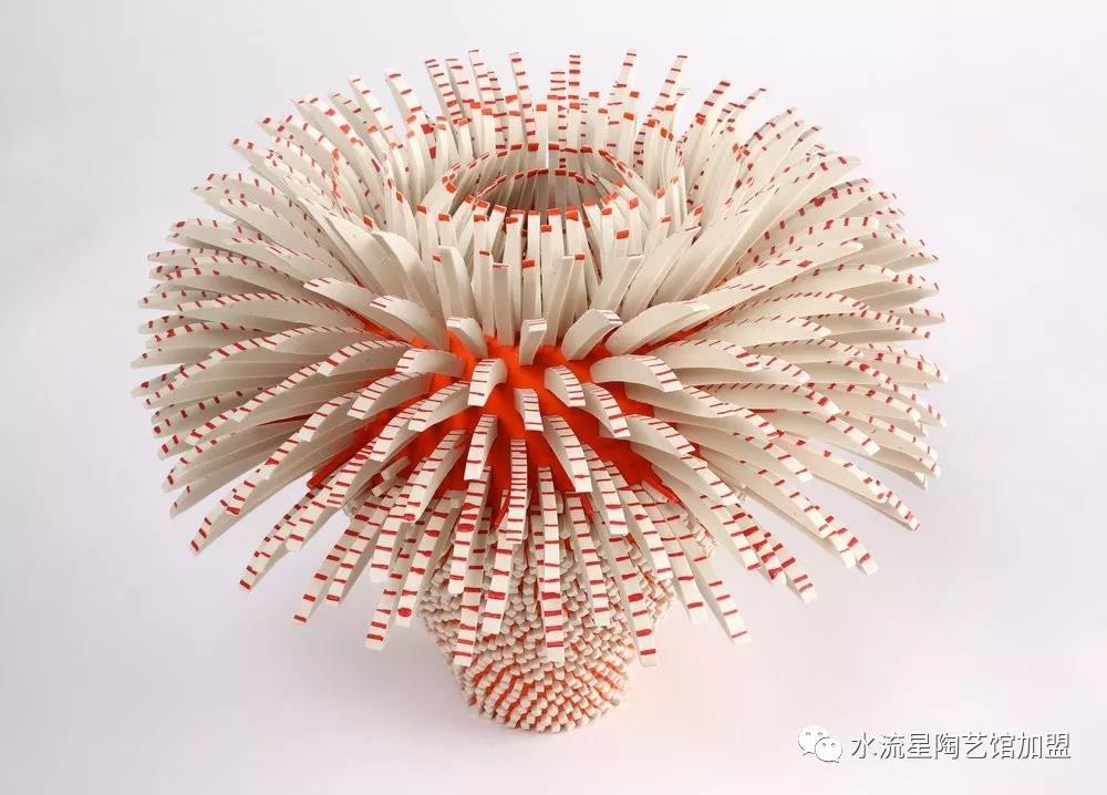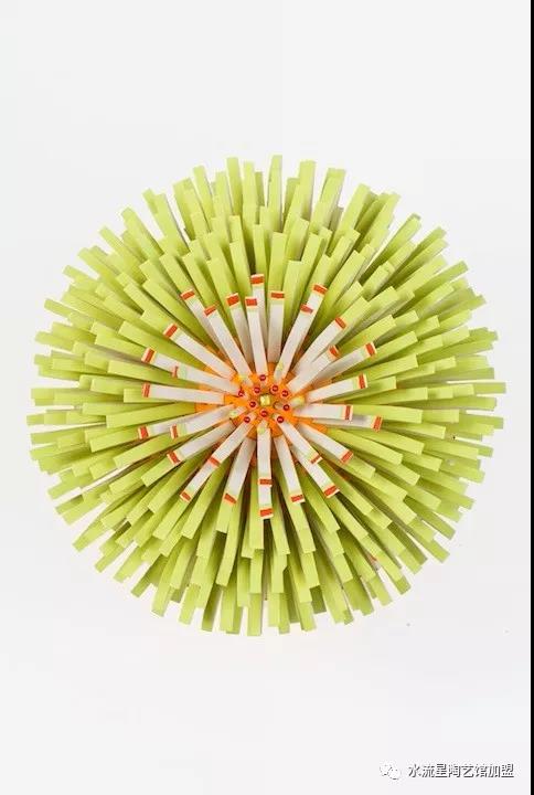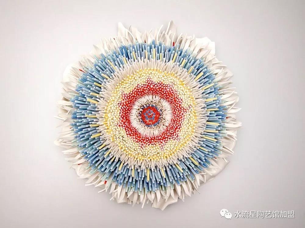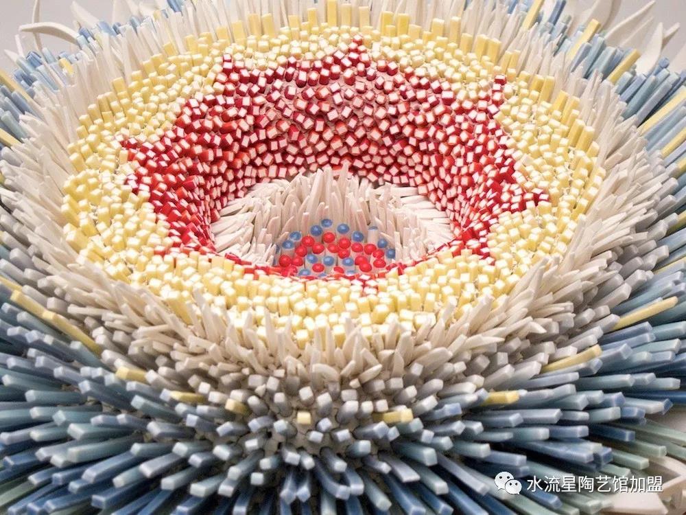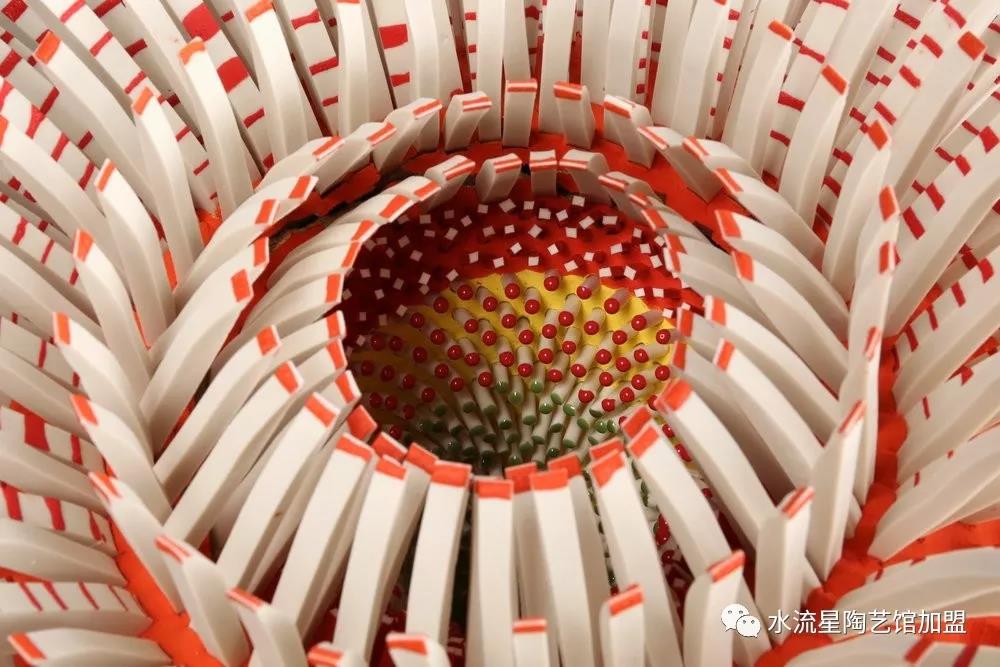 Peled根據(jù)它們的長度,顏色和形狀來安排碎片。長條碎片被作為花蕊點綴在中心。為了構(gòu)建這些華麗的作品,Peled使用板坯輥來創(chuàng)建粘土片。然后她用錘子將它們打碎成小塊。這些碎片被分類后拼貼在她的雕塑中。